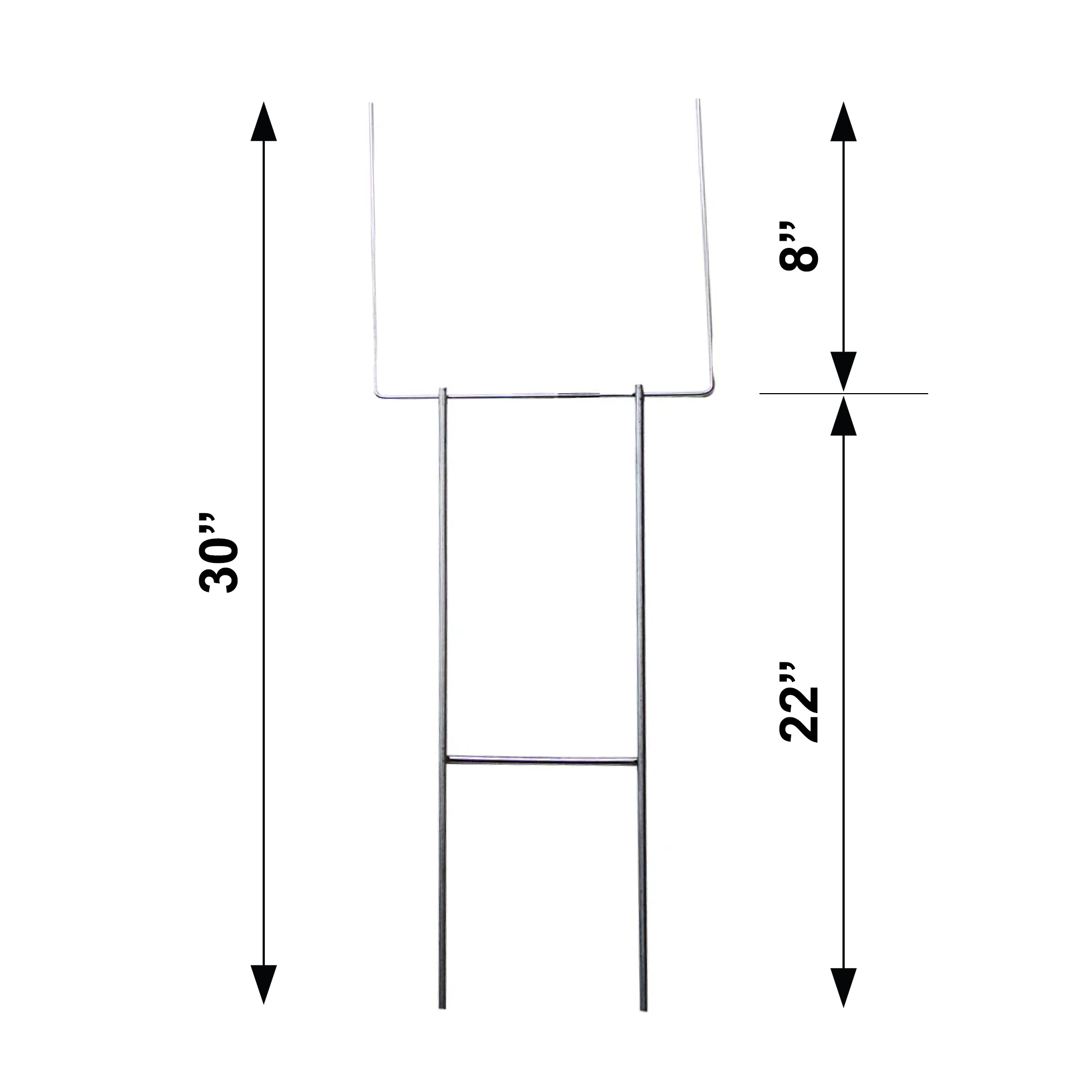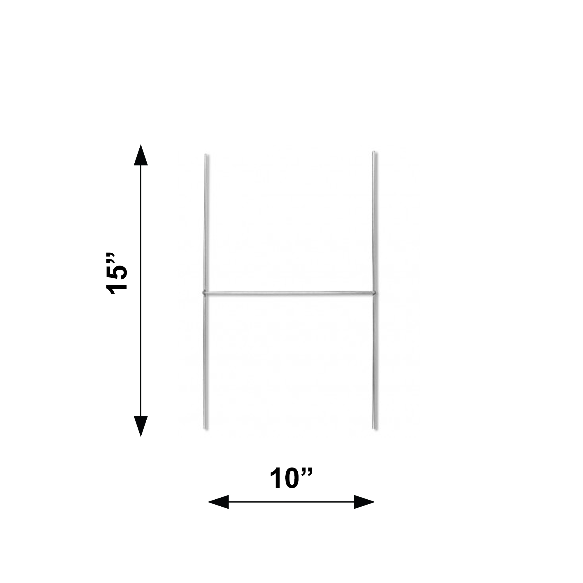 Wire stakes (commonly known as H-stakes) are lightweight metal stands used to hold corrugated plastic yard signs upright in the ground. Made from galvanized steel, they are designed to insert easily into soft ground like grass, soil, or dirt and fit snugly into the fluted holes of 4mm Coroplast signs.